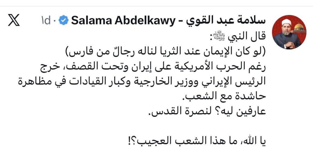 لم يعد الأمر دفاعا سياسيا عن دولة، بل تزكية عقدية صريحة لمشروع باطني يُراد له أن يتسلل إلى وعي الأمة تحت شعارات القدس والمقاومة.